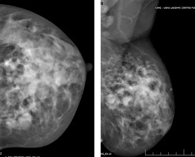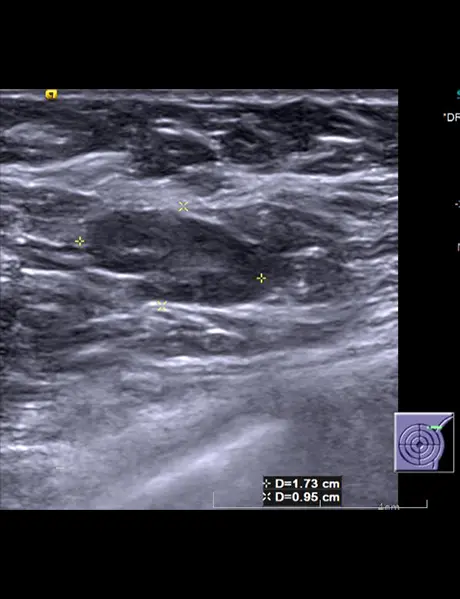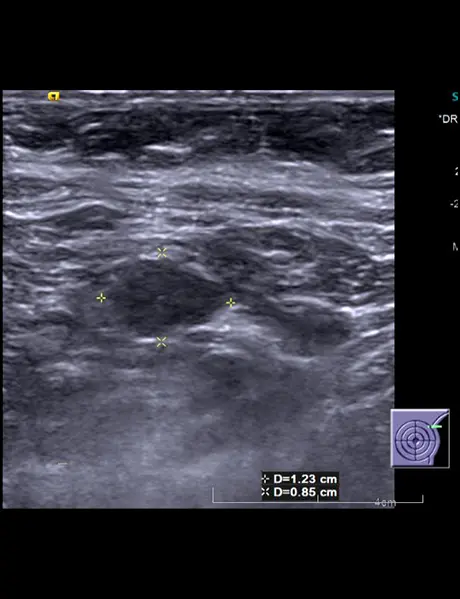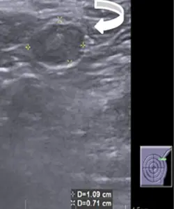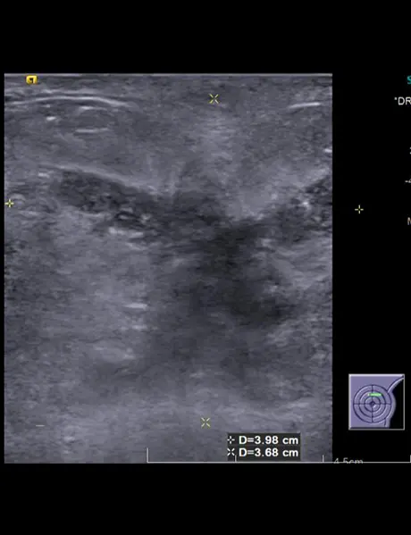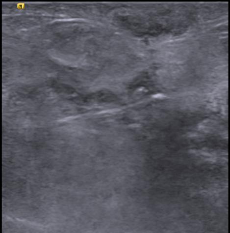 With a differential diagnosis of granulomatous mastitis and Invasive ductal carcinoma ,USG guided core Biopsy was done from the lesion