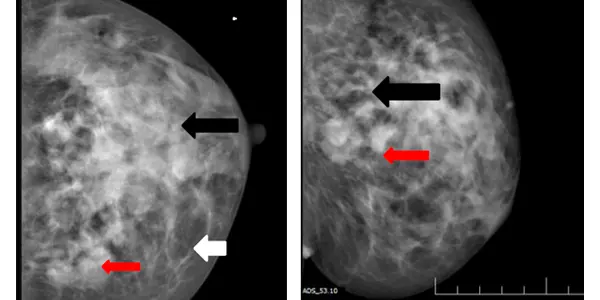 A) & B) Left breast CC and MLO view showing large asymmetric density in upper and central quadrant of left breast (black arrows) with associated interstitial thickening (white arrow) and architectural distortion .Multiple mass like areas seen in the medial and lower quadrant (red arrows) of left breast