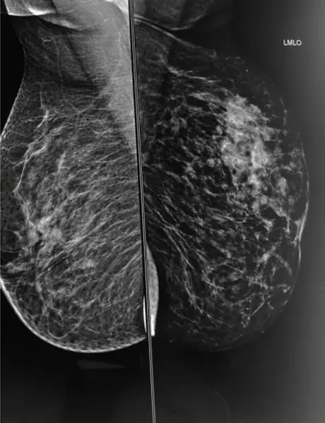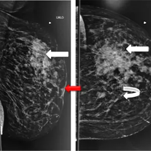 A & B) Left breast MLO and CC views showing irregular medium to high density mass in upper and outer quadrant of left breast ( straight white arrows) with associated interstitial thickening ( curved white arrow), ductal dilatation, skin thickening and retraction of the nipple (red arrow).