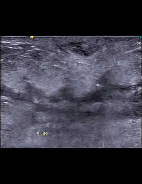 Left breast USG showing mass forming area consisting of multiple thickened dilated ducts extending into the subcutaneous region (straight white arrow). There is parenchymal edema surrounding this area of abnormality.