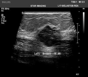 Mammography- Fairly well circumscribed predominantly sold lesion in the left breast UIQ with partially obscured margins. No spiculations. No associated microcalcifications noted. Sonography: Well defined hypoechoiec lesion with smooth margins.
