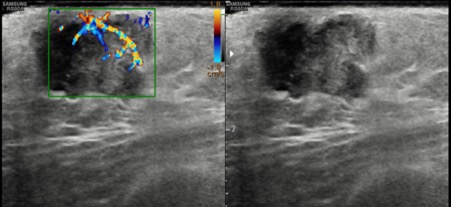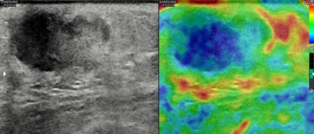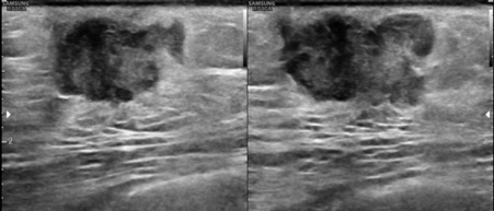 Bilateral Digital mammography , Craniocaudal (CC) and Mediolateral oblique (MLO) view revealed an irregular , high density mass with indistinct margin in retroareolar region with retracted nipple. No microcalcifications was seen. No significant axillary lymph nodes were present. Ultrasound of left breast showed an irregular, heterogeneously hypoechoic mass with indistinct margin and mild posterior acoustic enhancement, measuring about 2.5x1.9x1.3cm in retroareolar region. Internal vascularity was increased on colour doppler. On strain sonoelastogram, the mass showed increased stiffness suggestive of hard consistency. The imaging features are highly suspicious for male breast cancer and thus the mass was classified as BIRADS category 5 lesion and Ultrasound guided biopsy was advised. Patient underwent left modified radical mastectomy and final histopathological report was Invasive Lobular carcinoma. No nipple or lymphovascular invasion was identified.