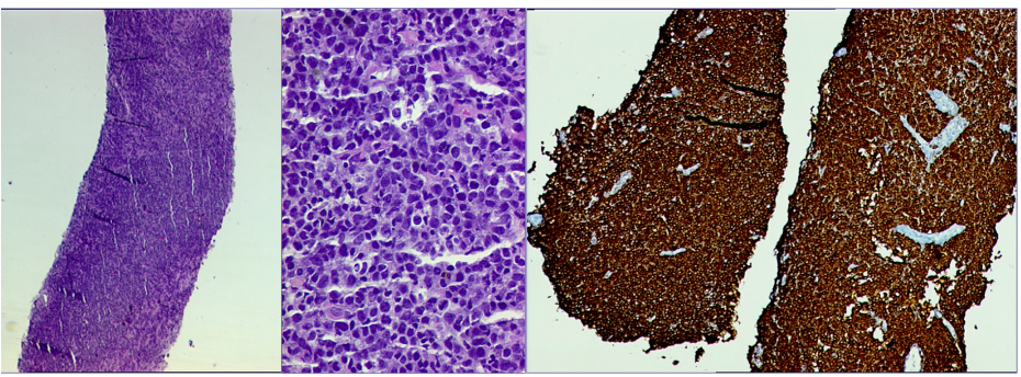 Differential diagnoses: Triple negative breast carcinoma, Phyllodes tumor, Cellular fibroepithelial lesion, Organized abscess, Lymphoma or Metastases. Diagnosis: Primary Breast Lymphoma