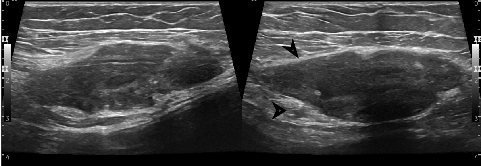Findings Her entire large bowel was studded with multiple polyps.The rectum and sigmoid had larger polyps as compared to the smaller rest of the bowel which has numerous smaller lesions(Image 1).An ultrasound of her breast was undertaken for the right breasy mass lesion .The ultrasound showed a rather circumscribed lesion in the upper inner quadrant of the right breast splaying fibres of the pectoralis (Black arrowheads in Image 2 ).The lesion was clinically firm to hard and showed no appreciable vascularity on Doppler (Image 3). A USG guided biopsy of the lesion was undertaken which showed spindle cells that were positive for CD99 ,SMA,Desmin and Negative for S100, pan CK, CK 5/6, p63 and CD117,CD 34 . Ki 67 index was less than 3%.(Image 4) . ?eta Catenin showed strong diffuse nuclear positivity(Image 4) . Diagnosis of a spindle cell neoplasm, morphology and immunoprofile favoring Desmoid fibromatosis was given on pathology . Patient eventually underwent prophylactic pancolectomy.She presented a few months post surgery with irregular soft tissue density masses at site of surgical incision on the right rectus (Image 5) and a large intra abdominal mesenteric mass causing distortion and dense bowel adhesions (Image 6). These were diagnosed as fibromatosis on imaging