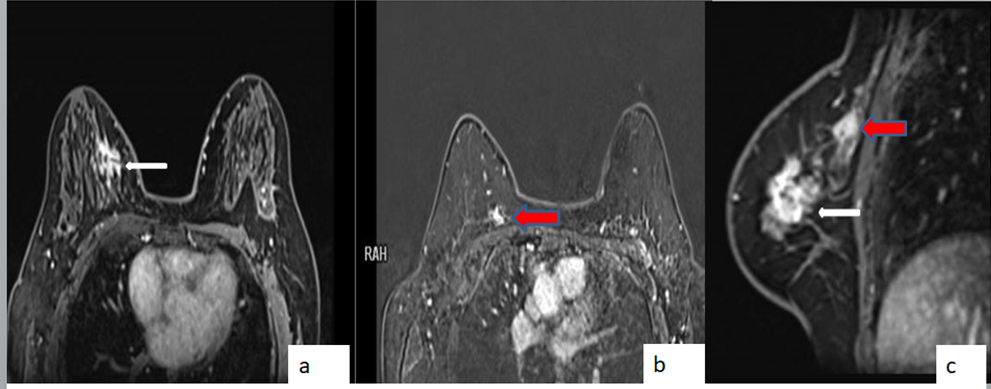 Figure 1- MLO (a) and CC (b) screening mammogram of the right breast with heterogeneous dense breast parenchyma shows a heterogeneous dense spiculate mass in lower inner quadrant (better seen on CC views; white arrow in figure 1b ). Figure 2 : Ultrasound shows a hypoechoic mass with spiculate margins, non parallel orientation and posterior acoustic shadowing. Figure 3: CEMRI reveals an irregular heterogeneous enhancing mass in lower inner quadrant (white arrow in figure 3a, c) and an additional small irregular heterogeneous enhancing mass in the upper inner quadrant (red arrow in image 3a, c) . Figure 4: Second look ultrasound revealed a hyperechoic mass with mild heterogeneity and indistinct margins which was not clearly appreciated with normal compression (figure 4a) and is better appreciated with excessive focal compression (figure 4b) . USG guided biopsy is performed as the mass was suspicious on CEMRI. Final histopathology for the second lesion - IDC
