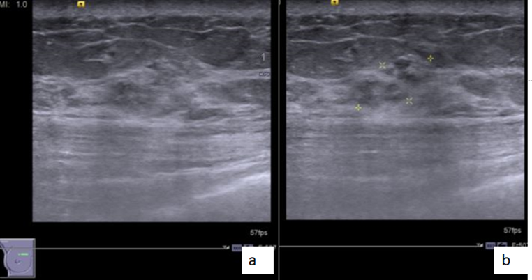 Most of the breast malignancies have hypoechoic appearance on ultrasound. Although extremely rare, hyperechoic breast malignancies do exist (1). Differential diagnoses for malignant hyperechoic lesions include invasive lobular carcinoma and invasive ductal carcinoma, DCIS, metastasis, lymphoma, and sarcoma (2). Echogenic breast lesions should be carefully evaluated and properly categorized based on suspicious sonographic characteristics and must be correlated with mammographic findings and clinical history to lower the threshold for biopsy and avoid delay in diagnosis. A comprehensive ultrasound scan should be performed with a careful search for the presence of suspicious sonographic features such as non-parallel orientation, posterior shadowing, and irregular margins (3). Hyperechogenicty should not be considered as a characteristically benign feature and should not supersede the less specifically benign features of the same lesion on the other examination.