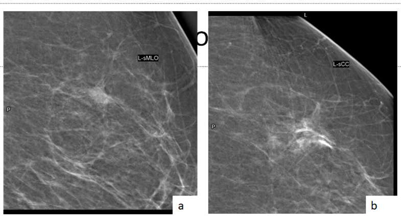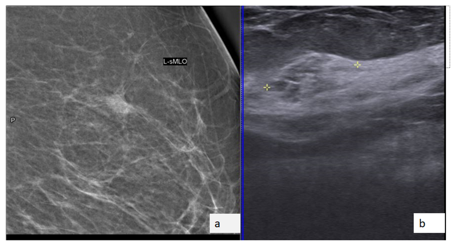 Figure 1: MLO view of left breast of year 2017 (figure 1a ) and 2019 (figure 1b) reveals a new focal asymmetry in upper half of the left breast (white arrow). Figure 2 – (a) The spot compression MLO view shows persistence of asymmetry on spot compression view. (b) Ultrasound reveals a small heterogeneous mass with mixed hyperechoic and hypoechoic areas in the region of mammographic focal asymmetry. Figure 3: (a, b)The mass detected on ultrasound is confirmed to be a true correlate of the mammographic abnormality by injecting a small amount of contrast under ultrasound guidance and a subsequent mammogram is taken. Ultrasound guided biopsy was performed due to increased suspicion of malignancy as the focal asymmetry was an interval appearance in a postmenopausal woman who has previously been treated for contralateral breast cancer, irregular margins of the focal asymmetry on the spot compression view and the presence of mixed hyperechoic and hypoechoic components on ultrasound. Final histopathology - DCIS.