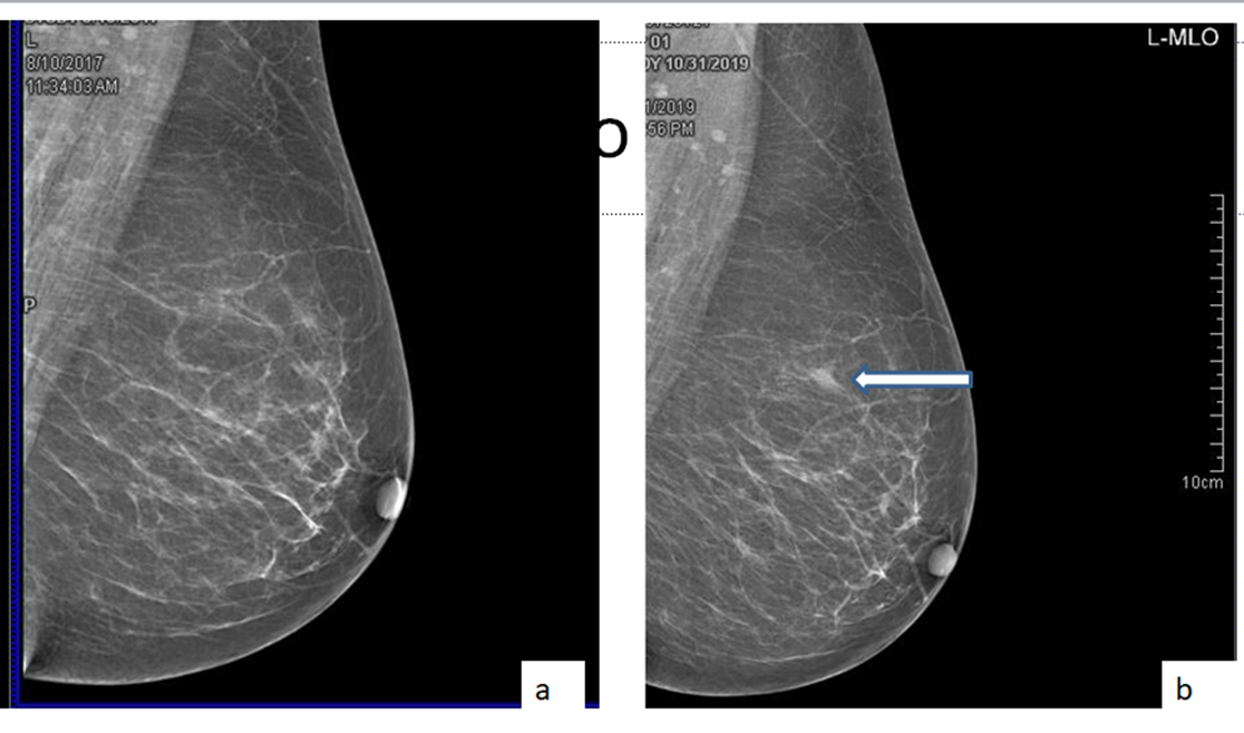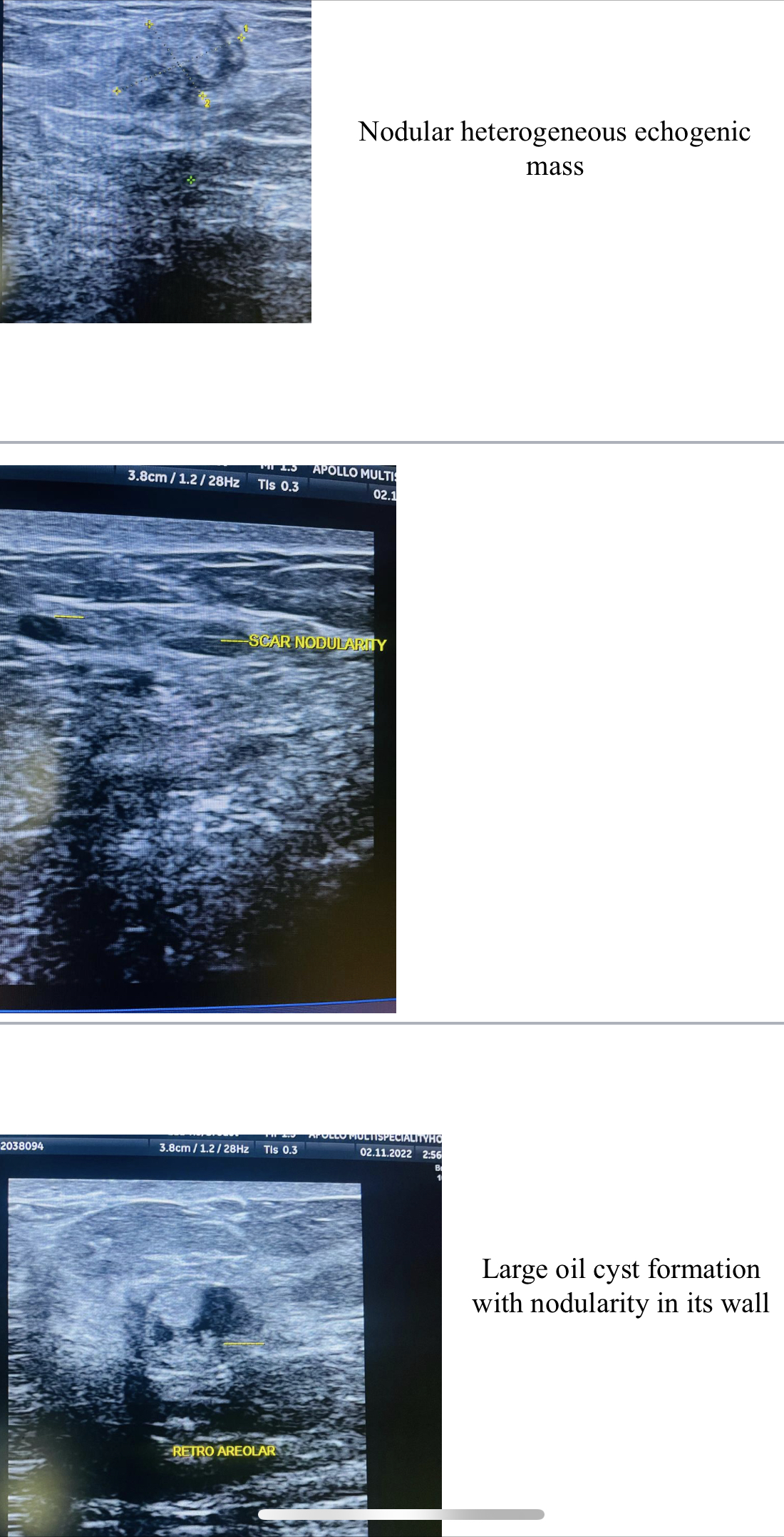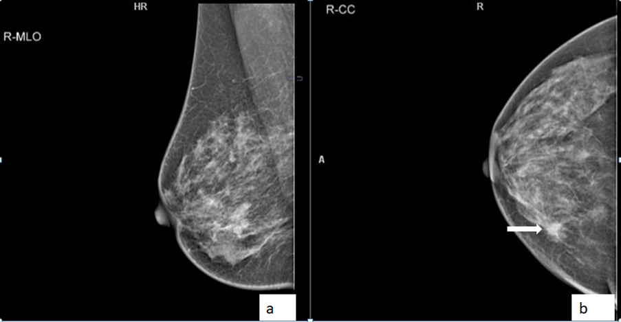 A 34-year-old woman presenting with a painless palpable right breast l...