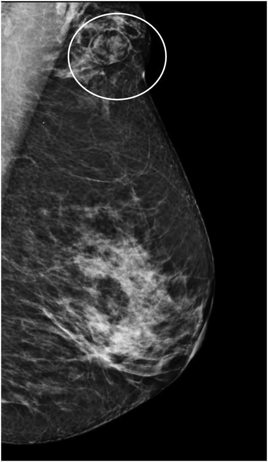 40-year-old lady came for a routine mammogram. Previous history of a l...